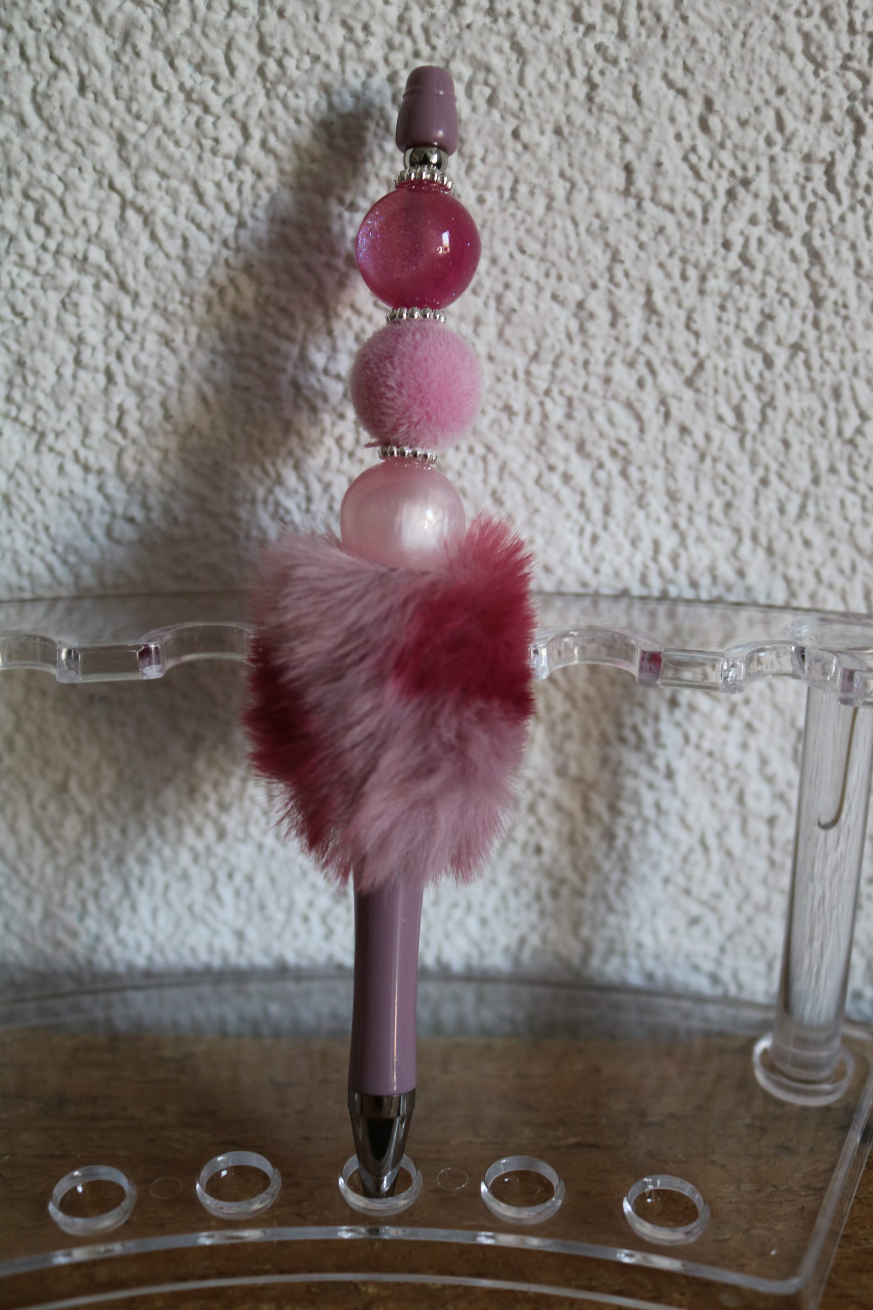 De pen is met luxe kralen afgewerkt en een fluffy.