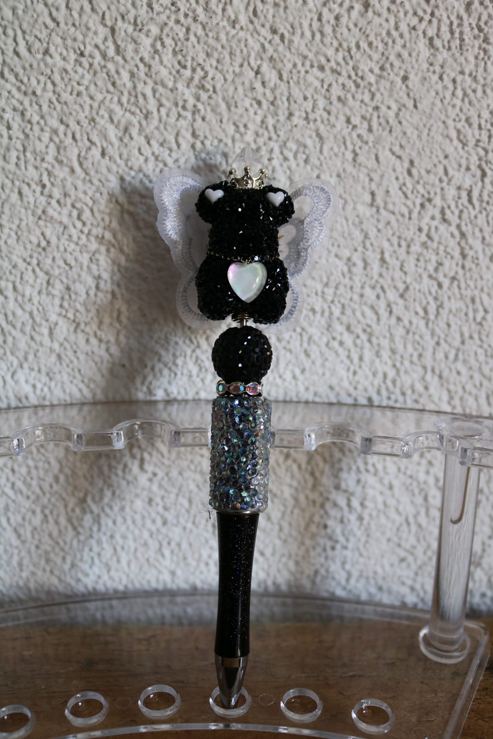 De pen is met luxe kralen afgewerkt en een beertje met vleugels.