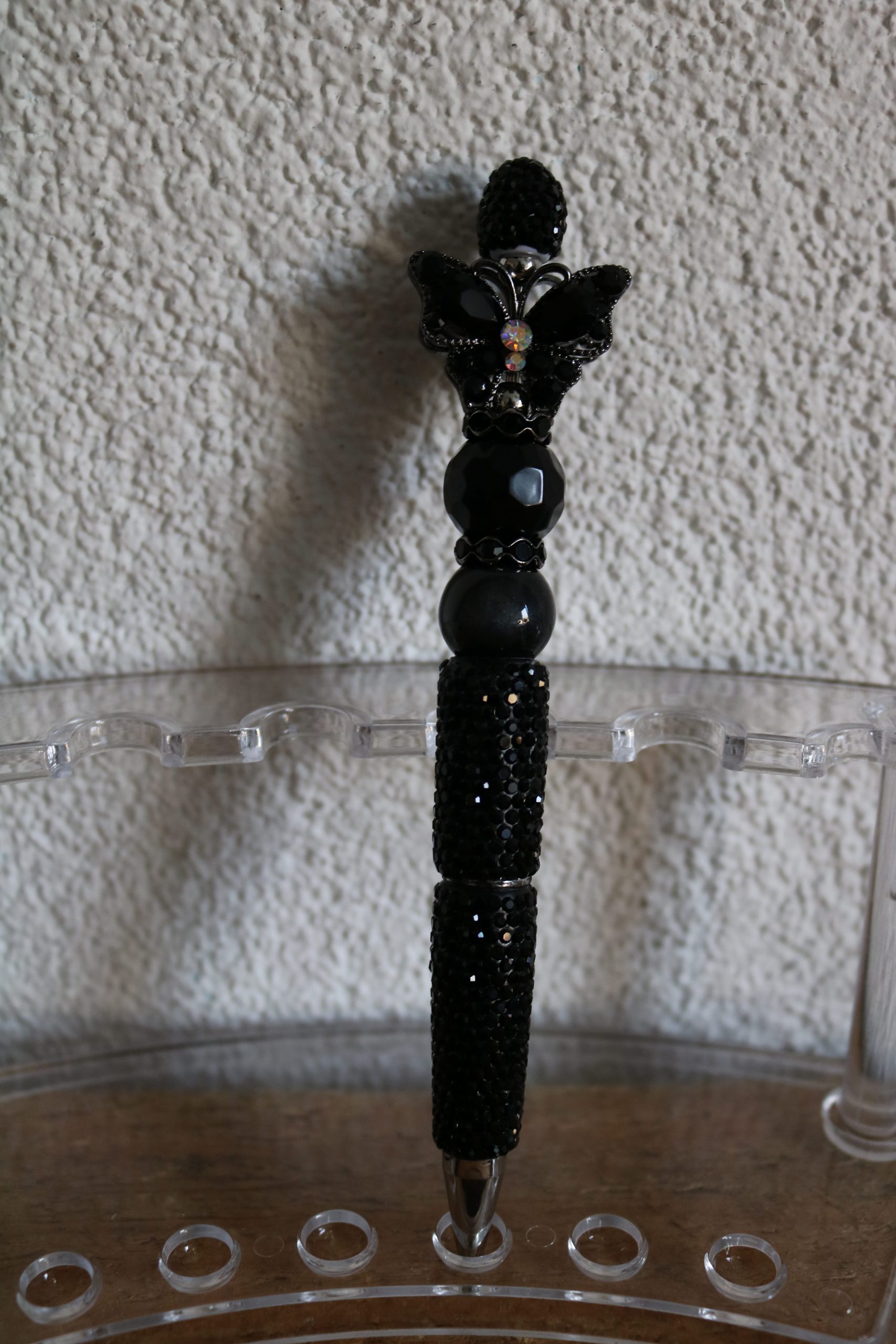 De pen is met luxe kralen afgewerkt en een mooie metalen vlinder met strass steentjes..