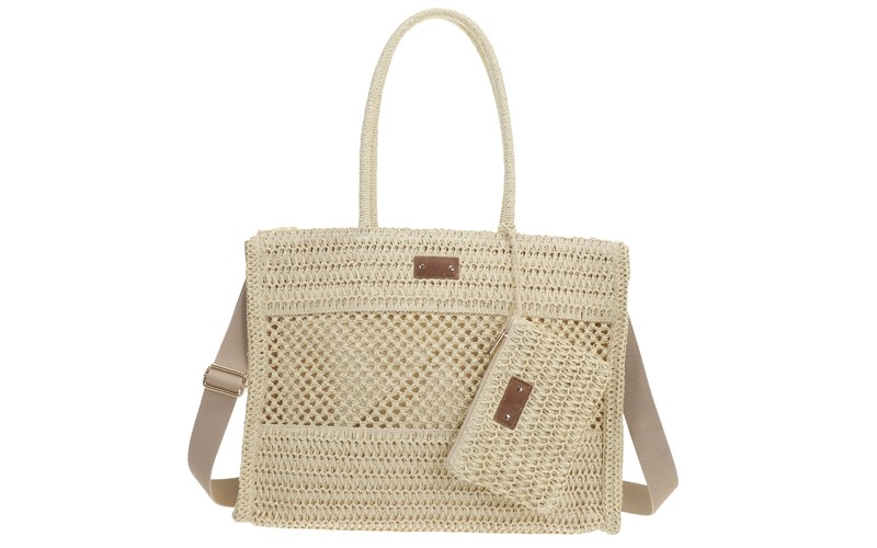 Zomerse blikvanger: Het geweven design en het brede rechthoekige silhouet van 45 cm geven de tas een populaire, strandklare uitstraling die een brede doelgroep aanspreekt.