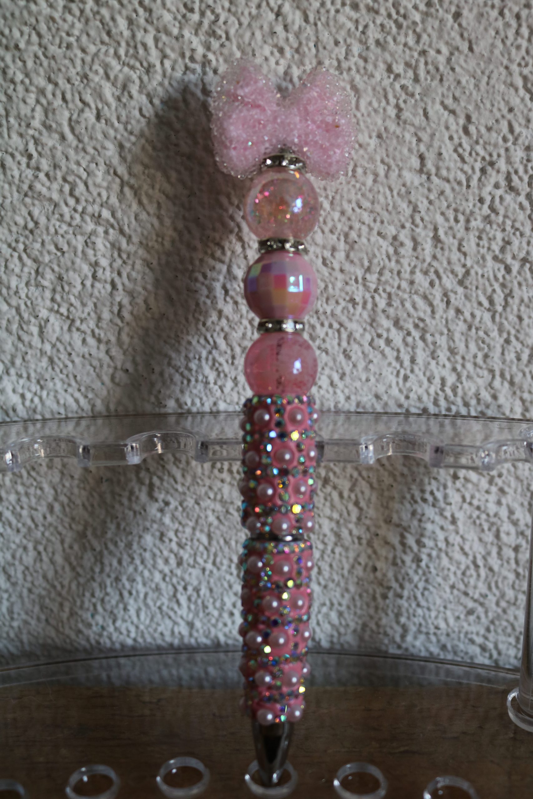 De pen is met luxe kralen afgewerkt en een strik.